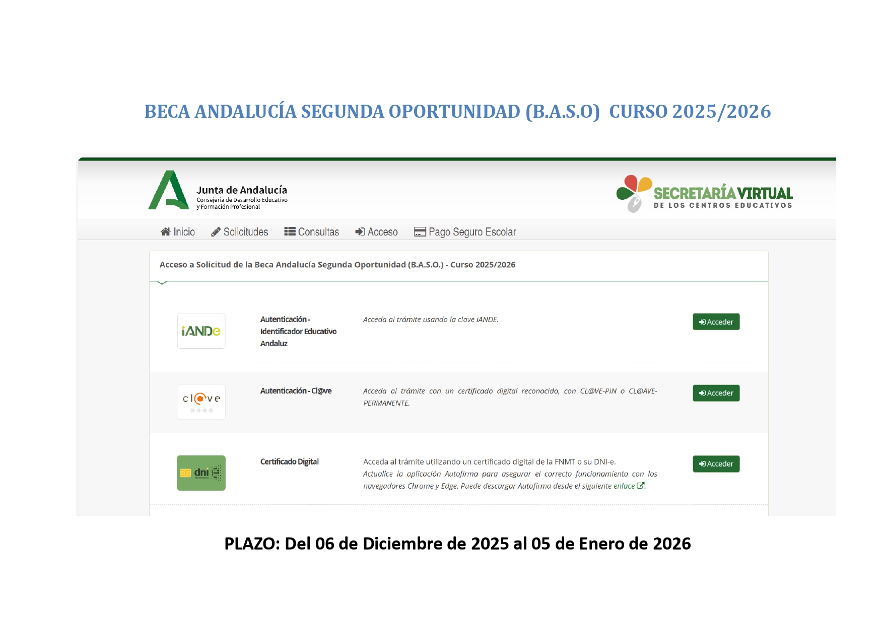 IMPORTANTE: En relación al alta de la cuenta corriente consignada en la solicitud, se informa que para la BECA BASO no es necesario realizarlo a través de la Secretaría Virtual de la Consejería, dado que la propia solicitud contempla ese trámite en el apartado 3.