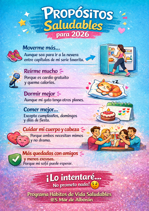 Os dejo los propósitos saludables del Programa Hábitos de Vida Saludables para 2026 porque cuidarnos también puede (y debe) hacerse con una sonrisa: moverse más, comer mejor, dormir cuando se pueda, reírse mucho …